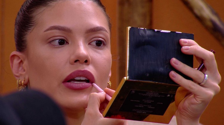 No Castigo do Monstro, Vitória Strada começa a se maquiar na área externa da casa, ao lado de seus aliados, na noite deste domingo (30). Guilherme questiona se a sister tem preenchimento labial, e ela nega.